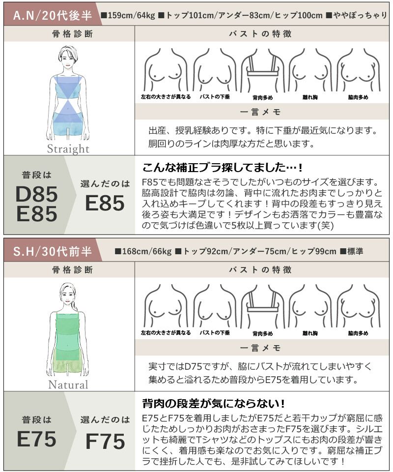 ラクシアスリープを使用していてとても気に入っていたのでこちらでブラも購入してみました。普段はF65ですが今回はE70を購入。サイズ感はちょうど良かったです。あまり胸を寄せてくれる印象は感じないですが着心地は良いです。脇高でカップも大きいので流れやすい胸でも安心です。ピンクと黒の組み合わせが大好きなので大きめサイズでも可愛いデザインがあって嬉しいです!