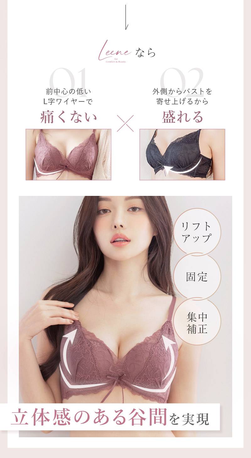 バストが自然と中央に寄るのに、寄せている感覚が無い不思議な着心地です。ブラのデザインと谷間でバストに華やかさが出ます。厚手パッドでボリュームを出すのではなく、自分のバストで自然な谷間をメイクするブラなので、着太りする心配もありません。