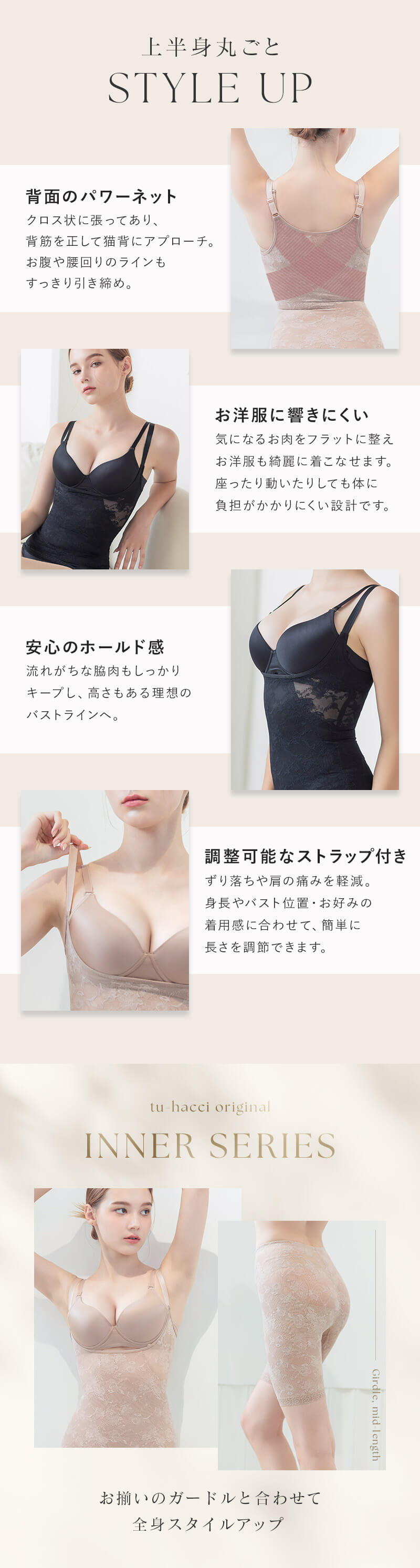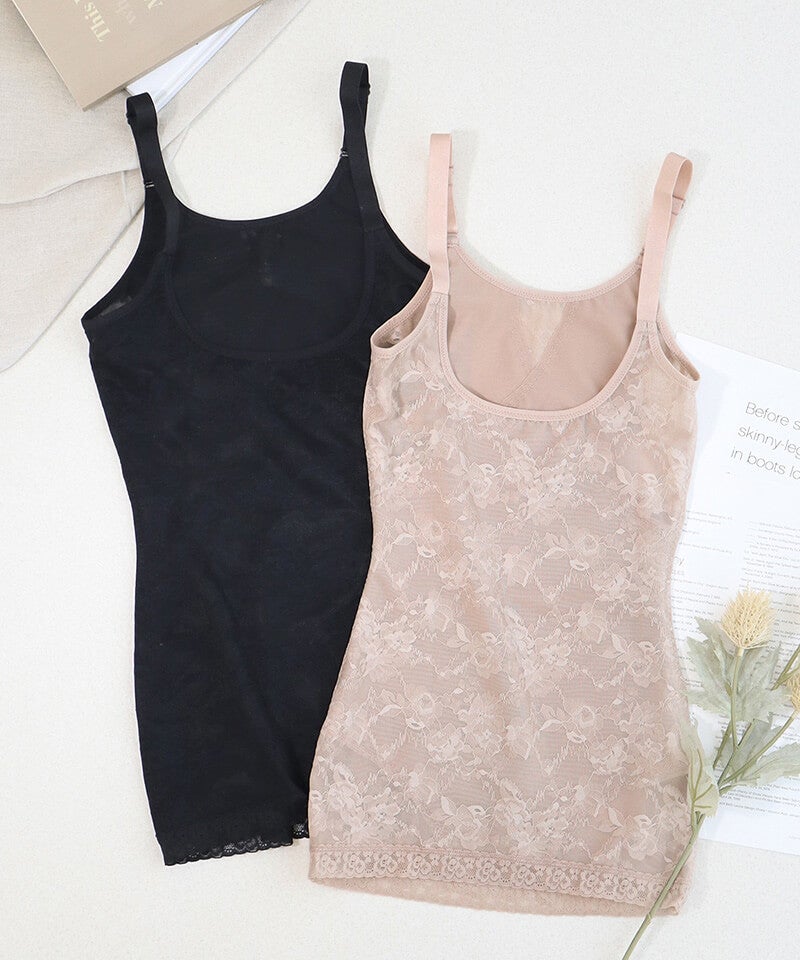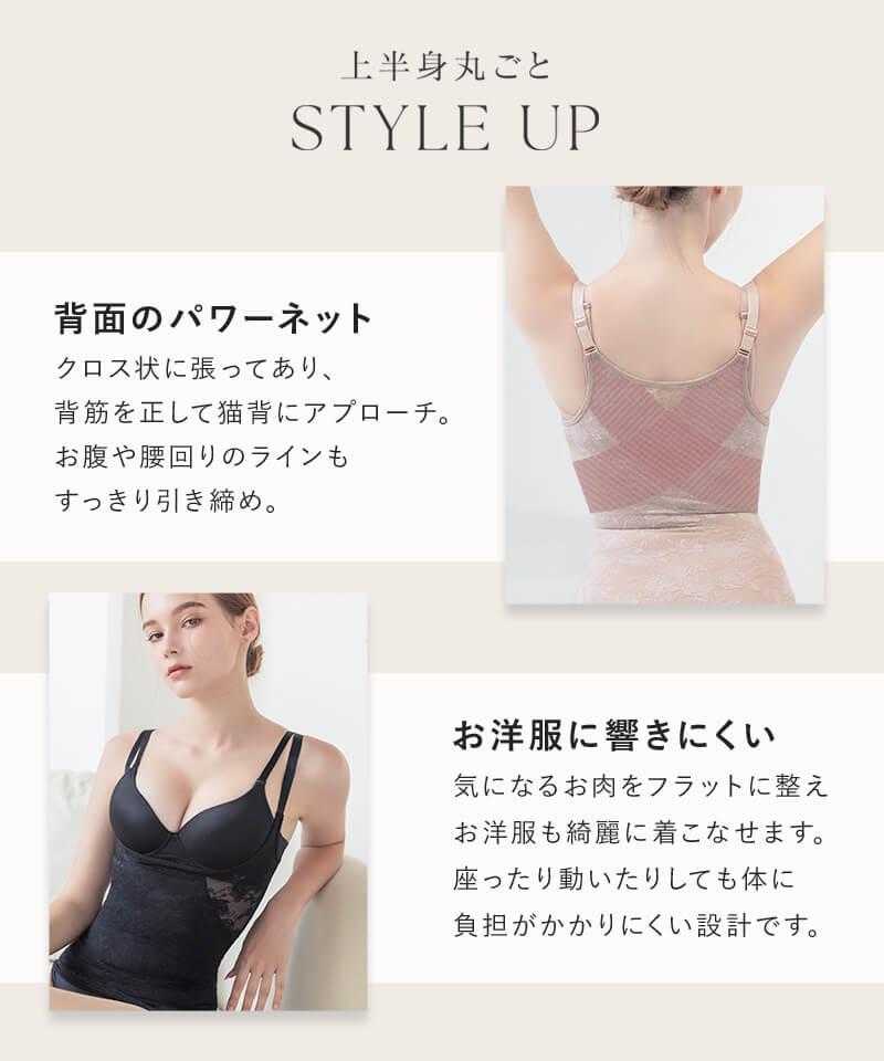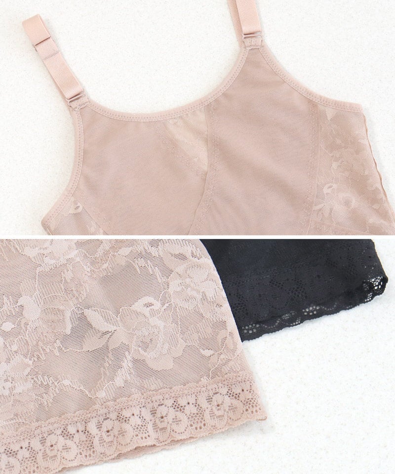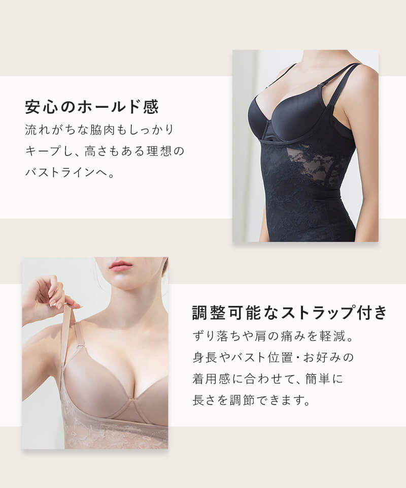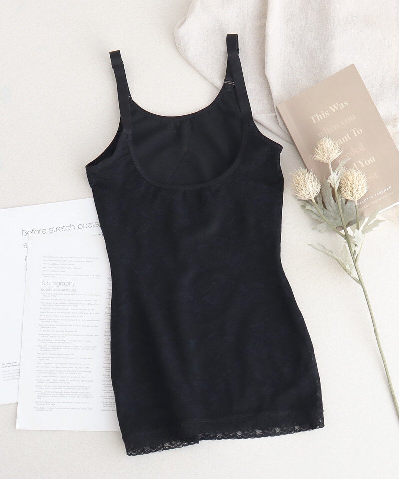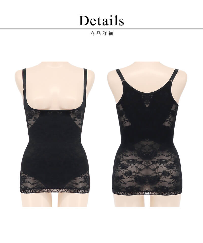 ストラップ取り外し:不可 ストラップ長さ調節:可 ホック:なし(かぶりタイプ) 透け感:若干あり 素材:ナイロン、ポリウレタン ボディシェイパー単品