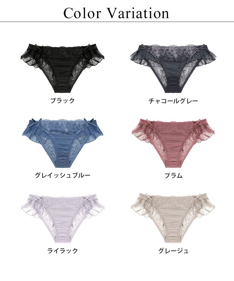 ふりふりがとてもかわいいです。 それでいてとても履き易いです。 ブラとお揃いのショーツが欲しかったのですが、売り切れていて。似た色味のこちらをチョイス。思ったよりブラと合っていて嬉しかったです!