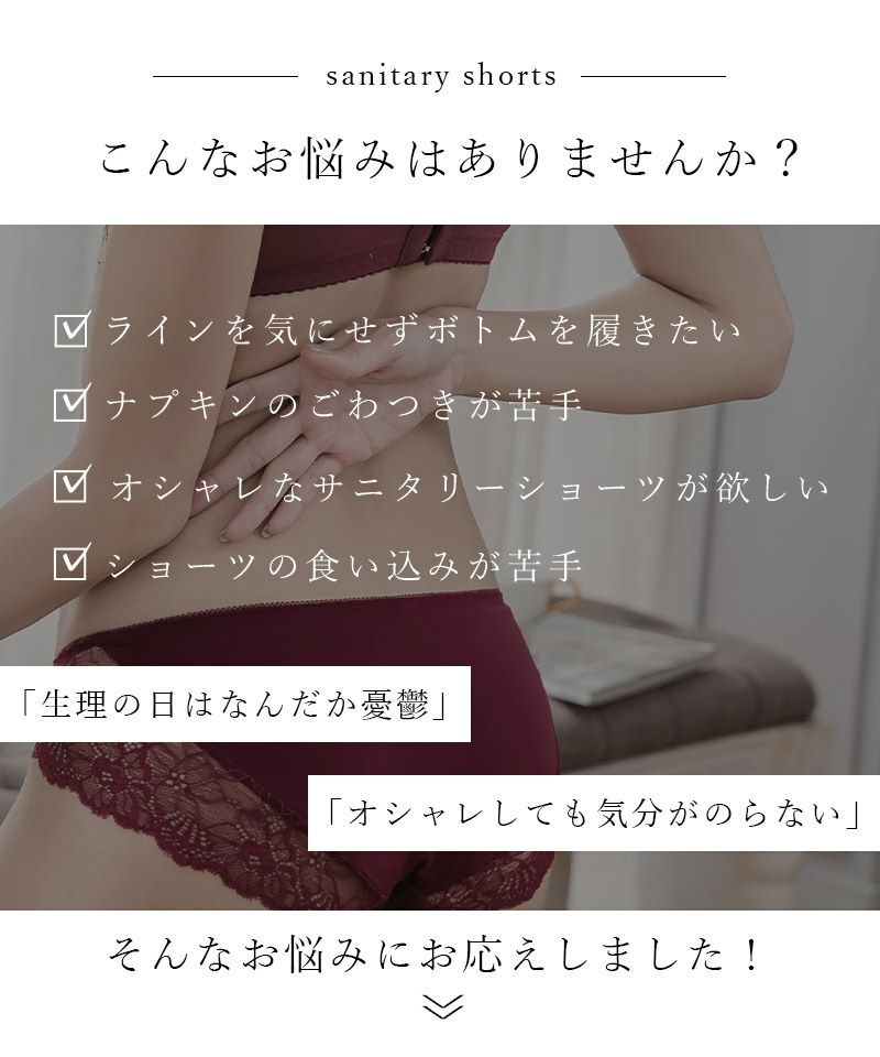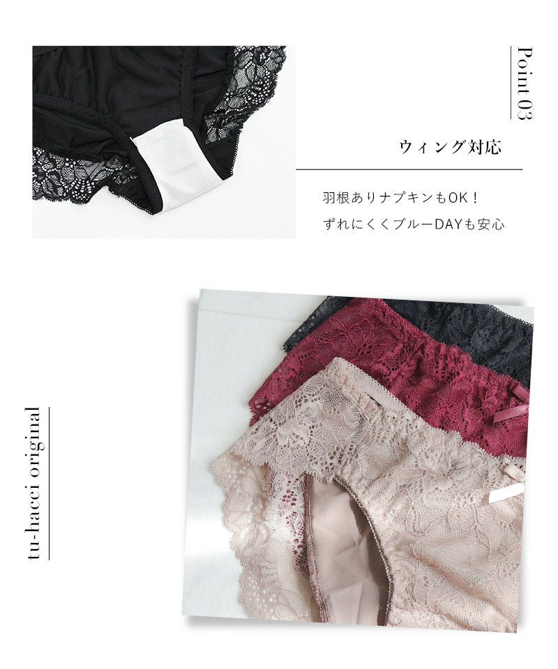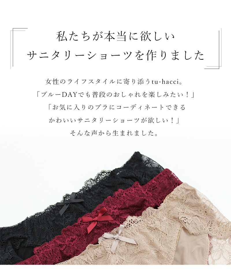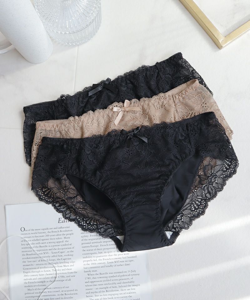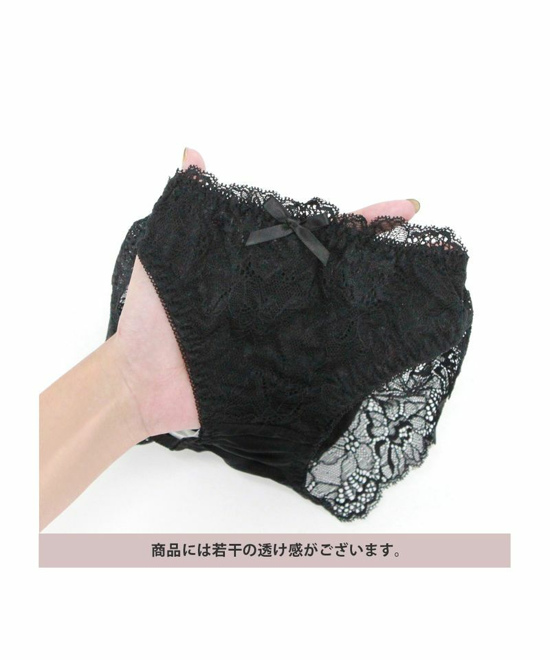 上品な花柄レースと大人っぽいカラーリングがマッチした、クラシカルなサニタリーショーツ。