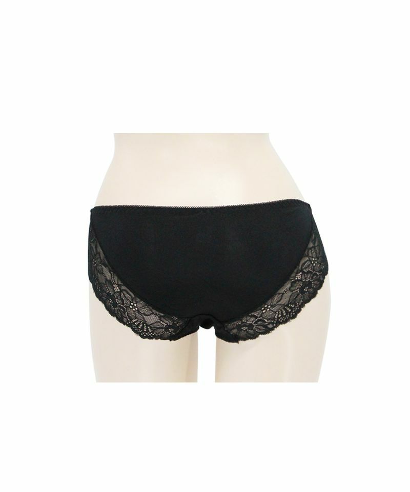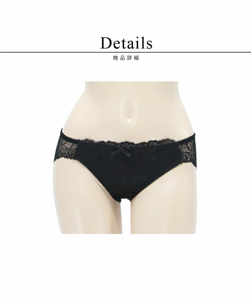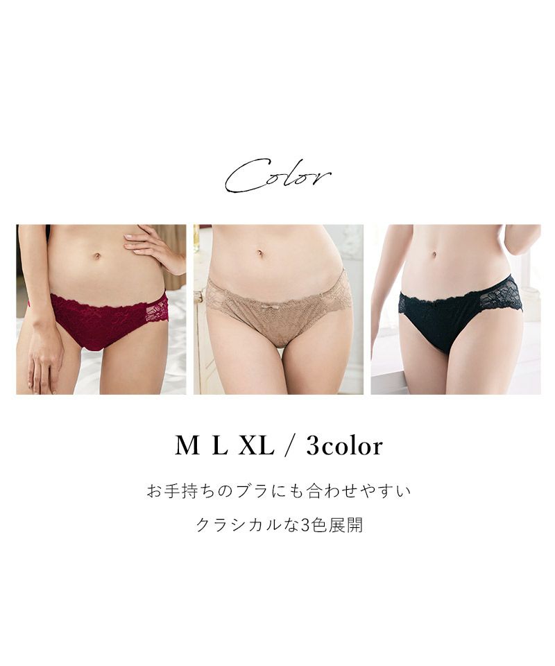 ヒップ部分は伸びの良いトリコット生地を使用し、レッグラインにはサイドから繋げるように幅広のレースを配置してリュクスな雰囲気を作りつつ食い込みを軽減。