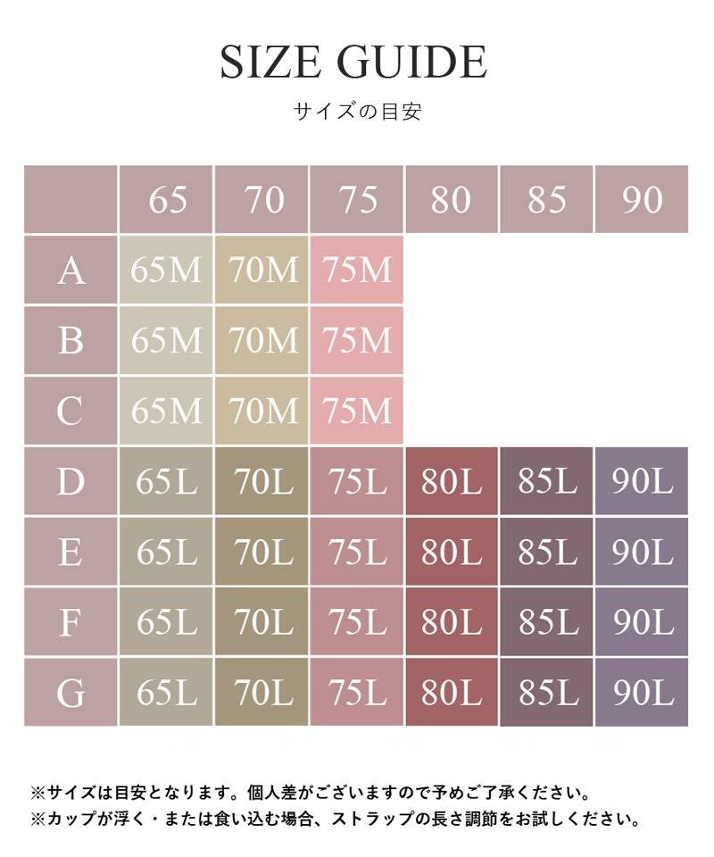 65M/ショーツS 65L/ショーツS 70M/ショーツM 70L/ショーツM 75M/ショーツL 75L/ショーツL 80L/ショーツXL 85L/ショーツXXL 90L/ショーツXXXL ※「ブラサイズ/ショーツサイズ」となっております。 上記以外の組み合わせはお選びいただけませんのでご了承ください。