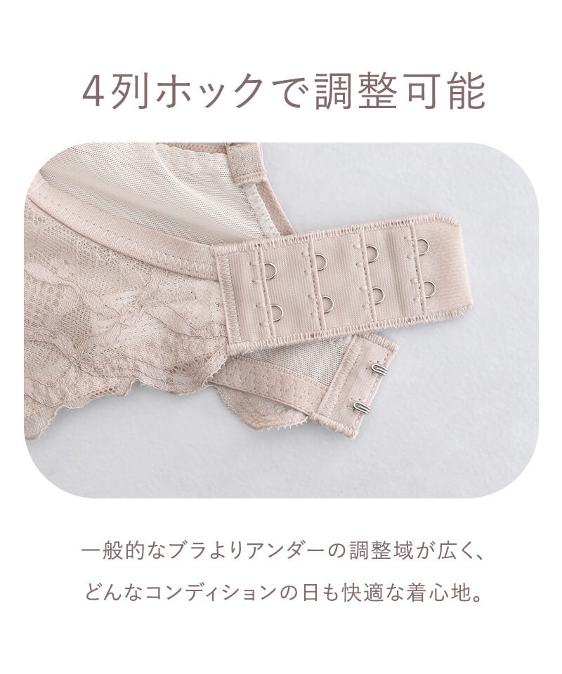 ストラップ取り外し:不可 ストラップ長さ調節:有り カップの仕様:モールド 調整用パッド:無し ワイヤー:無し ホック(ALL):2段4列 ブラ透け感:無し ショーツ透け感(Aタイプ):無し ショーツ透け感(Bタイプ):バックやや透け感有り