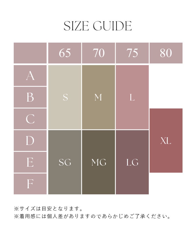 S/ショーツM SG/ショーツM M/ショーツM MG/ショーツM L/ショーツL LG/ショーツL XL/ショーツXL ※「ブラサイズ/ショーツサイズ」となっております。 上記以外の組み合わせはお選びいただけませんのでご了承ください。