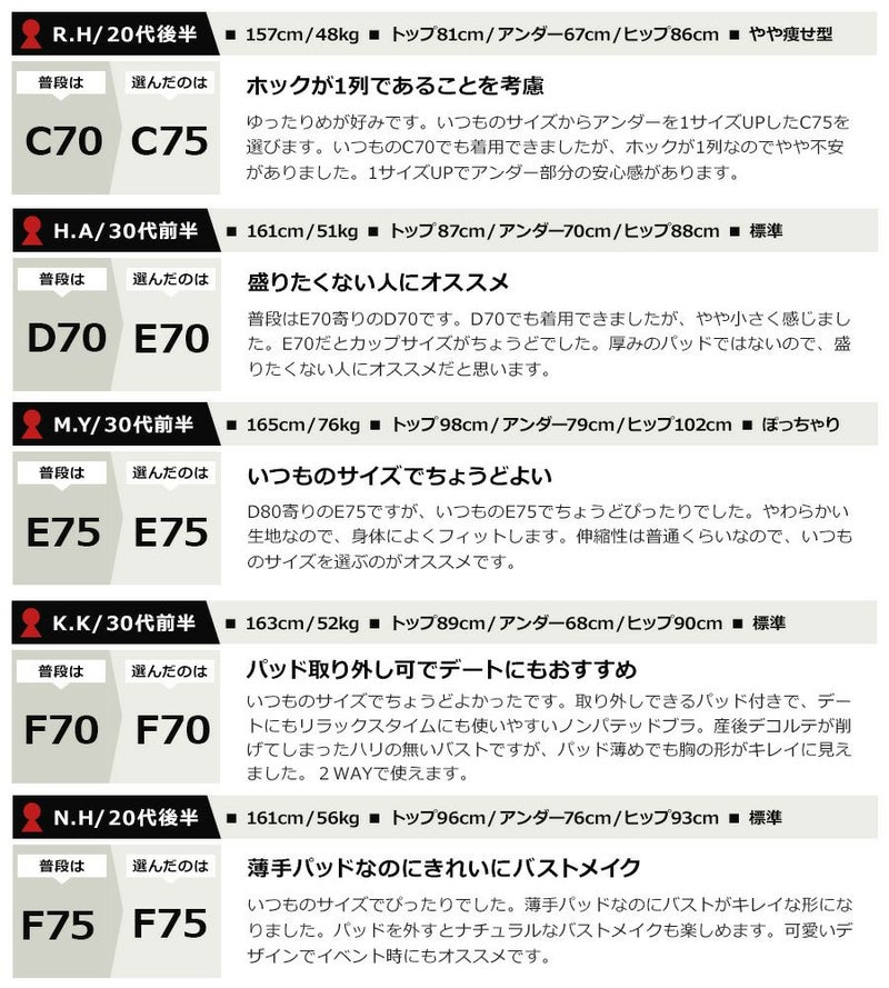 普段はE70寄りのD70です。D70でも着用できましたが、やや小さく感じました。E70だとカップサイズがちょうどでした。厚みのパッドではないので、盛りたくない人にオススメだと思います。