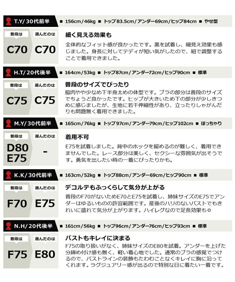 E75を試着しました。背中のホックを留めるのが難しく、着用できませんでした。レース部分は美しく、セクシーな雰囲気が出そうです。勇気を出したい時の一着にぴったりかも。