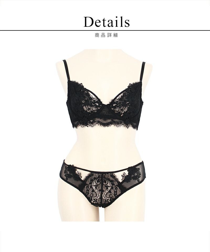 ストラップ取り外し:不可 ストラップ長さ調節:可 ワイヤー:有 パッド:無 ホック:2段3列 素材:ナイロン・スパンデックス・その他 ブラ透け感:あり ショーツ透け感:あり ブラ+ショーツ / 計2点セット