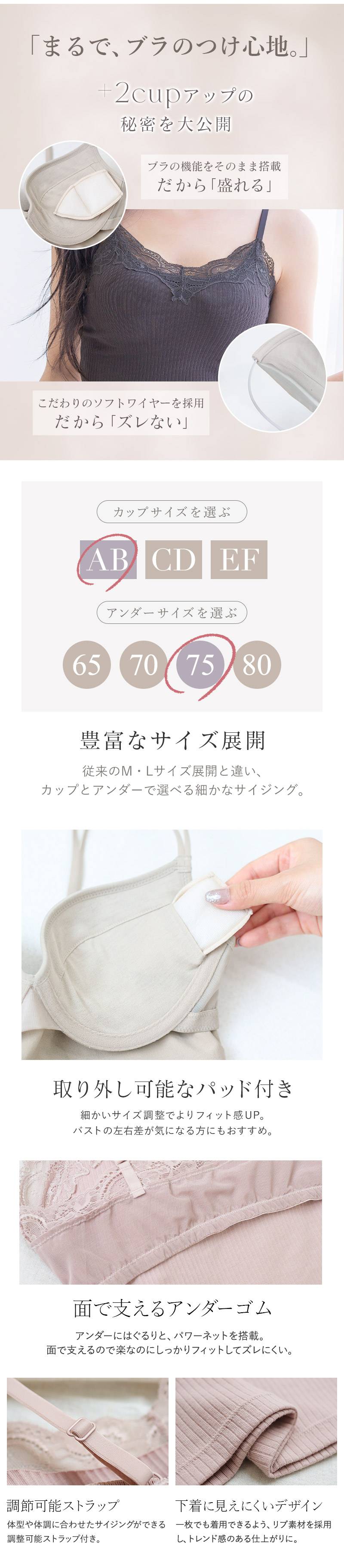 ストラップ取り外し:不可 ストラップ長さ調節:可 パッド:有 パッド取り外し:可 ワイヤー:有 ホック: 無 素材:コットン、ポリウレタン、その他 ブラキャミ単品