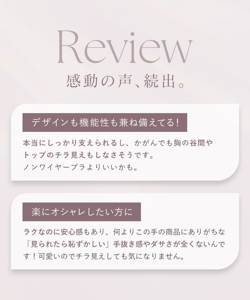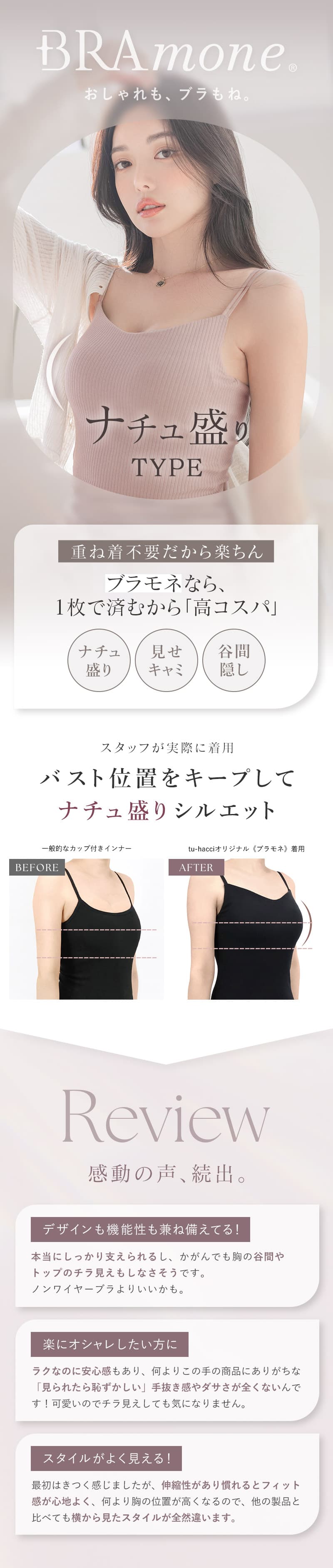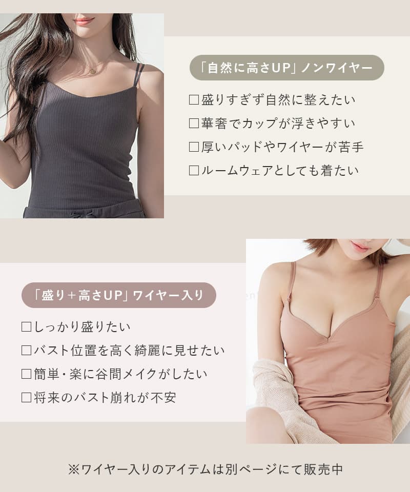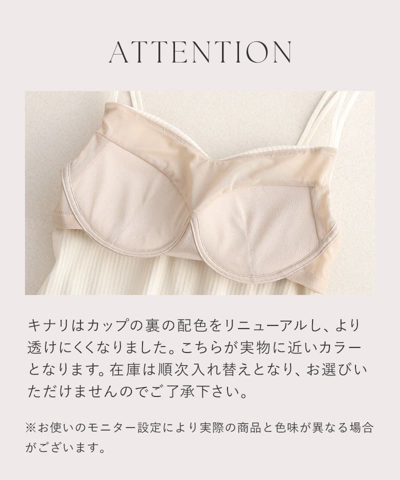 ※本商品は、バストがしっかりホールドされるよう一般的なブラトップよりフィット感が強めの設計です。 ※華奢な方やしっかりめの着用感がお好みの方は普段のサイズを、リラックスして着用したい方や、お肉が気になる方は1~2サイズ大きめをお選び下さい。 ※キナリは、カップの裏の配色をリニューアルし、透けにくさを向上させました。在庫は順次入れ替えとなり、お選びいただけませんのでご了承下さい。