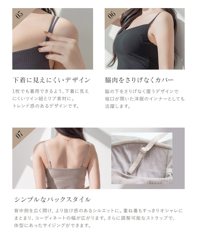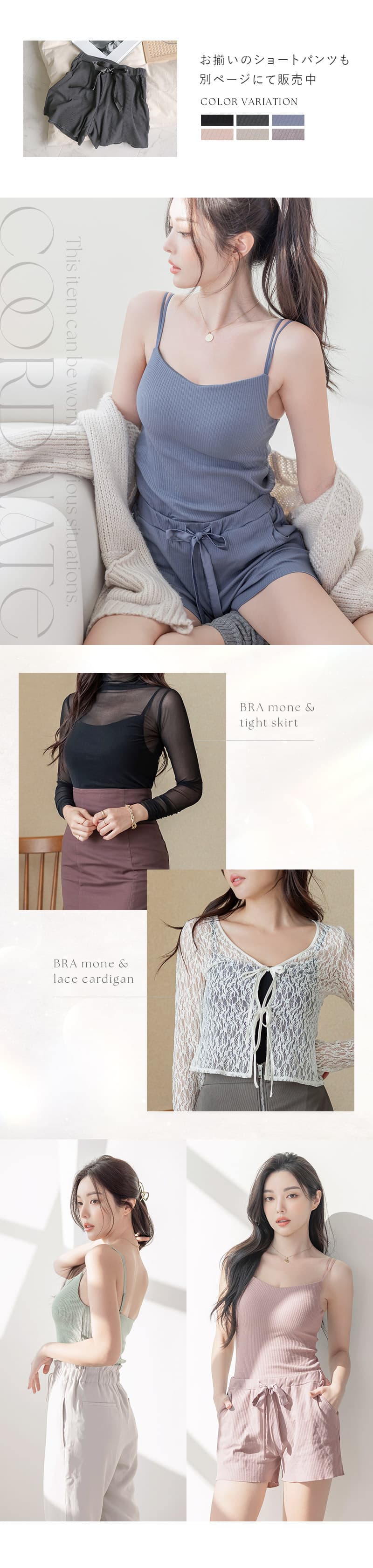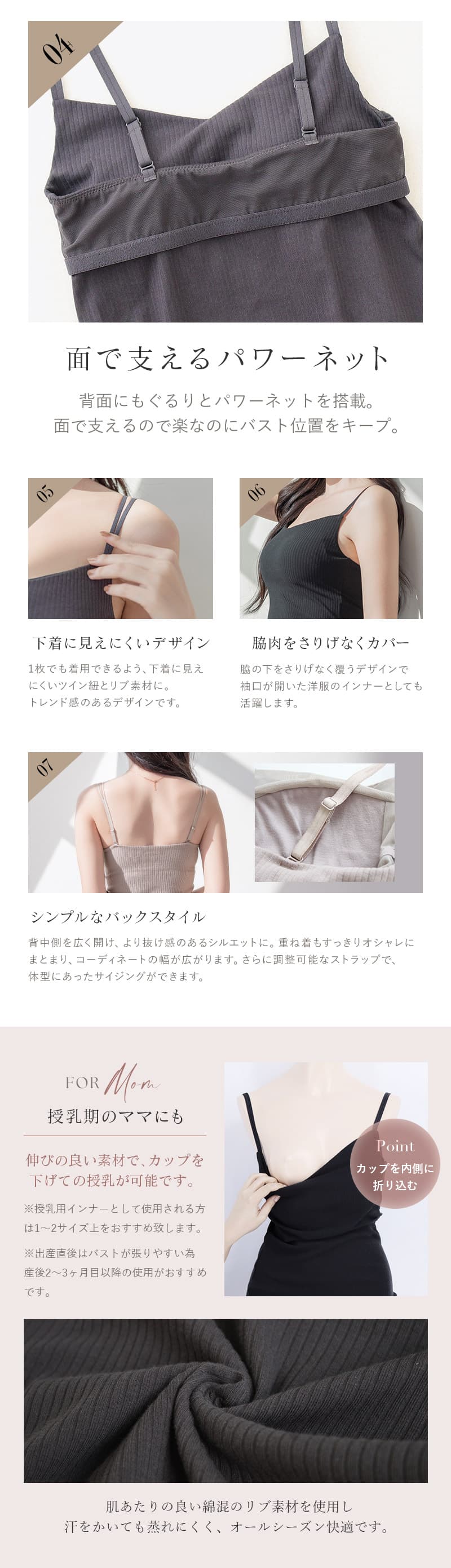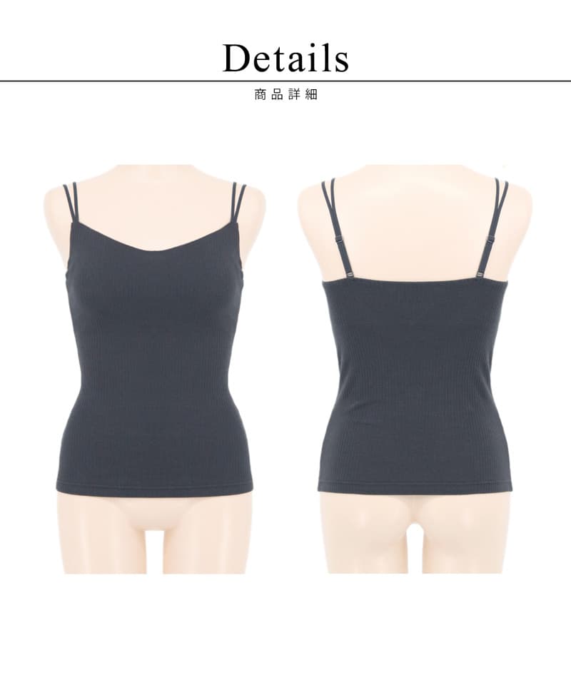 ストラップ取り外し:不可 ストラップ長さ調節:可 パッド取り外し:不可 ワイヤー:なし 素材:綿、ポリウレタン、その他 キャミソール単品