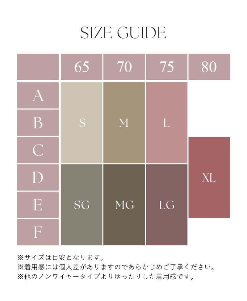 普段はC65を使用しているので、SGサイズを選びました。しっかり動いてもズレたり擦れたりせずピッタリです!ノンワイヤーなので部屋着としても使いたいなと思います。