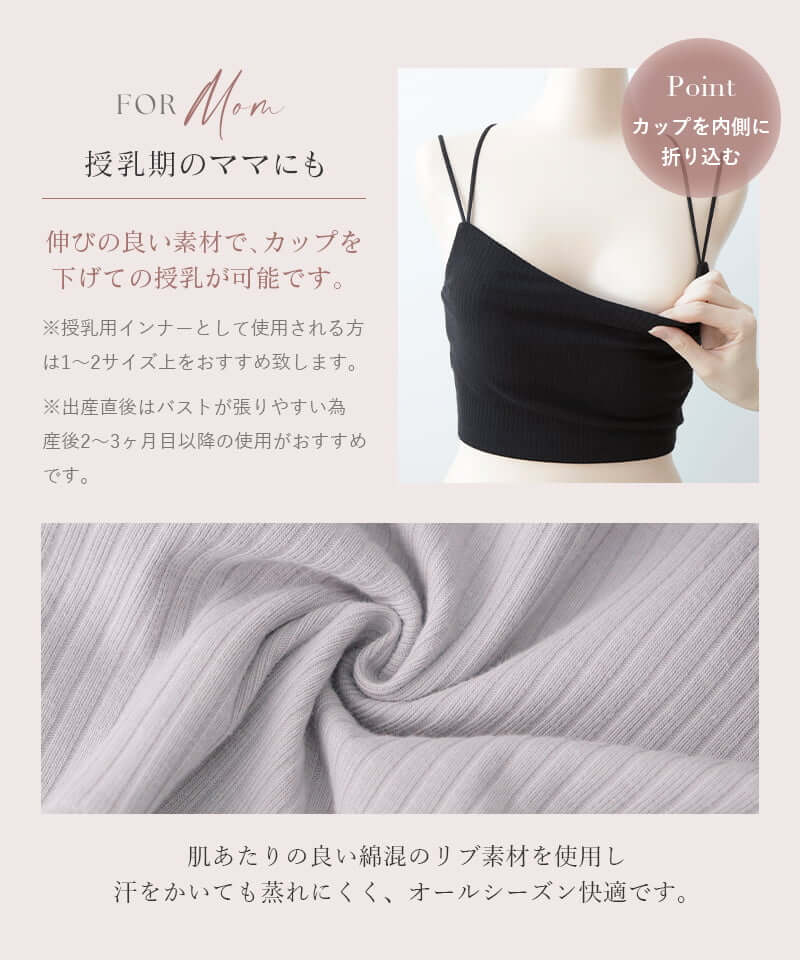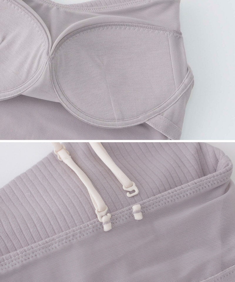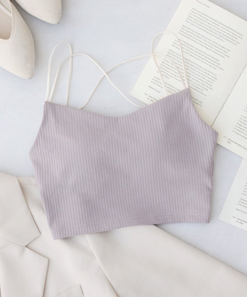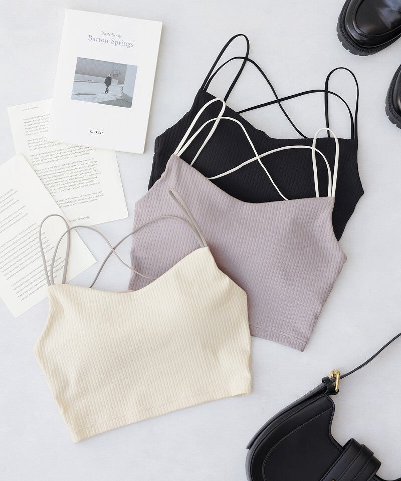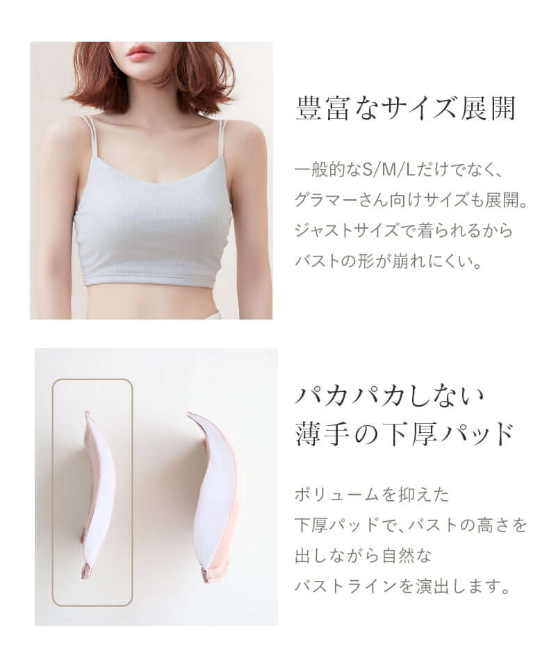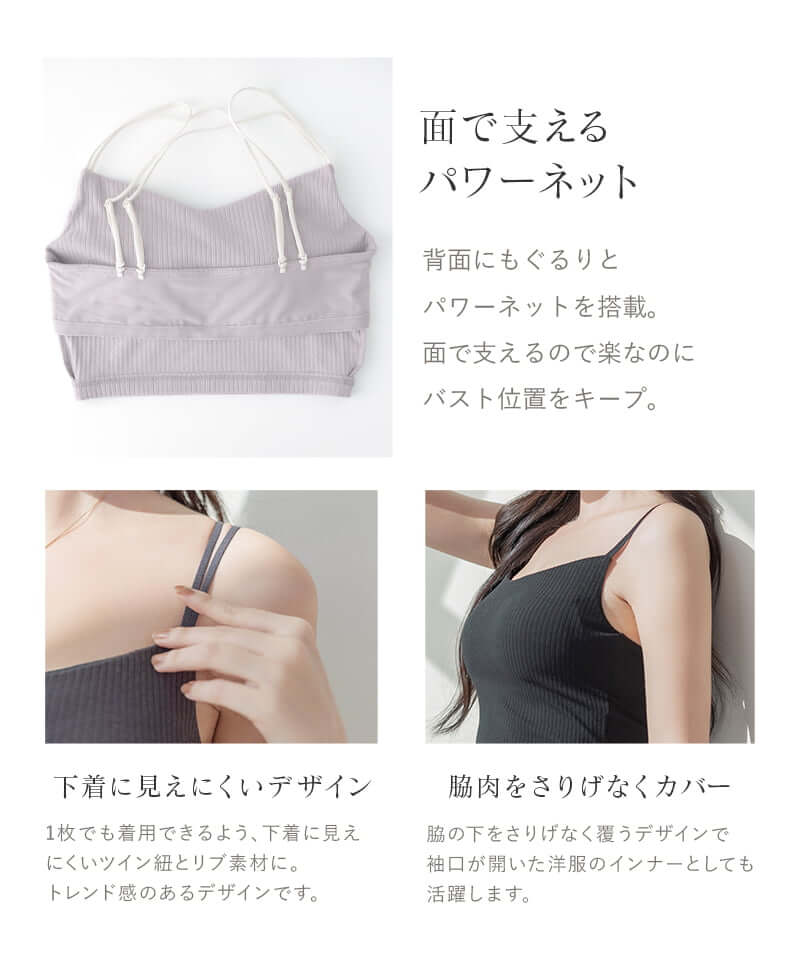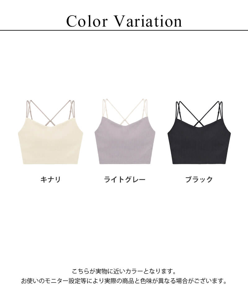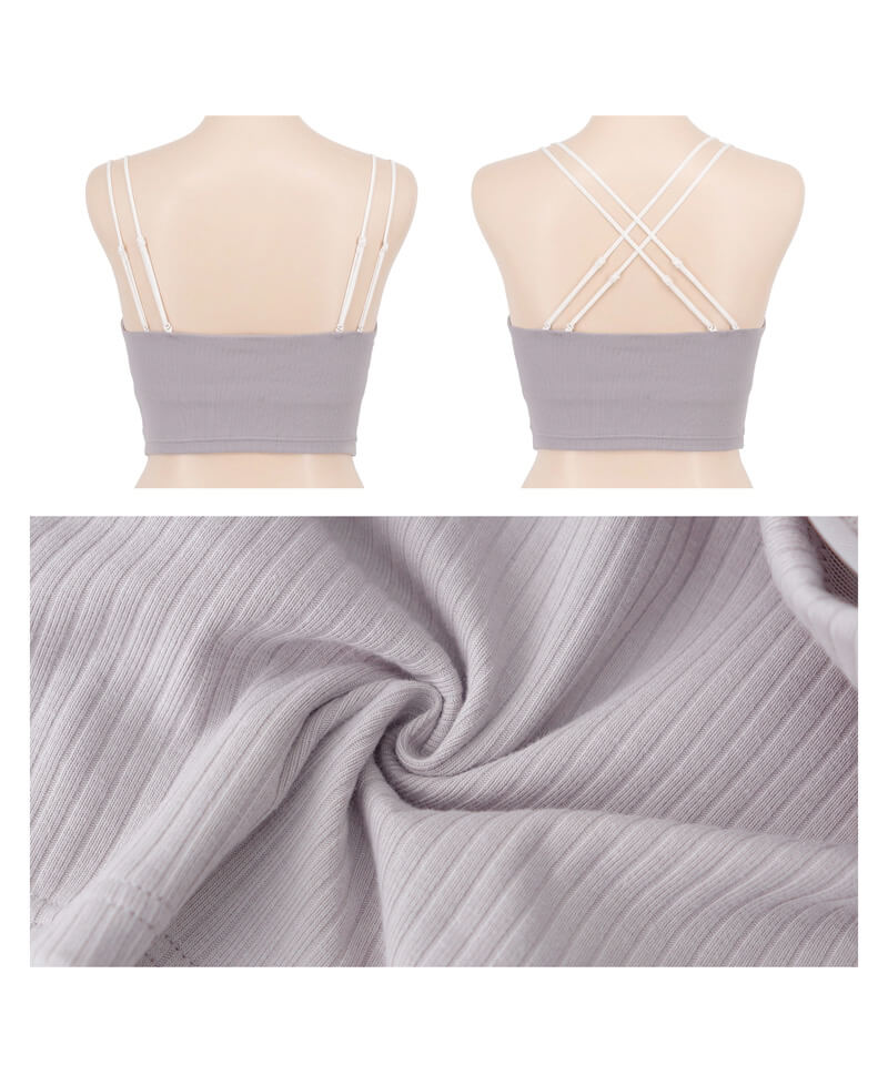 ストラップ取り外し:後ろのみ可(3way仕様) ストラップ長さ調節:有り カップ:有り 調整用パッド:無し ワイヤー:無し ホック:無し 透け感:無し 素材:コットン、ポリウレタン