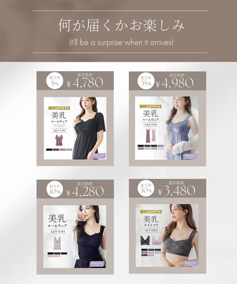 他の画像を見る お気に入りに登録する 【予約販売】2026福袋 ラクシアシリーズお楽しみ福袋 ¥ 2,980 税込 4.58 (52) 販売期間 2025/12/01 10:00 〜 #雑誌掲載 #ノンワイヤー