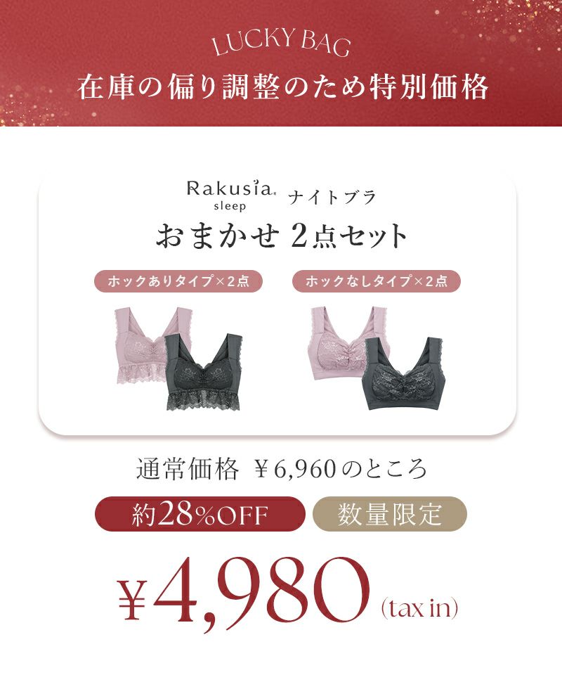 他の画像を見る お気に入りに登録する 2026福袋 まるごと包むナイトブラ「ラクシア」2点セット 通常価格 ¥ 6,960 ¥ 4,980 税込 4.62 (103) 販売期間 2025/10/03 19:00 〜 2026/01/03 23:59 #雑誌掲載 #ノンワイヤー 28%OFF